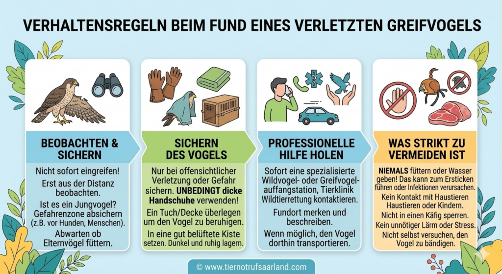Bei größeren oder wehrhaften Tieren wie Greifvögeln gilt grundsätzlich: immer Fachkräfte abwarten und niemals versuchen, solche Tiere allein zu sichern.