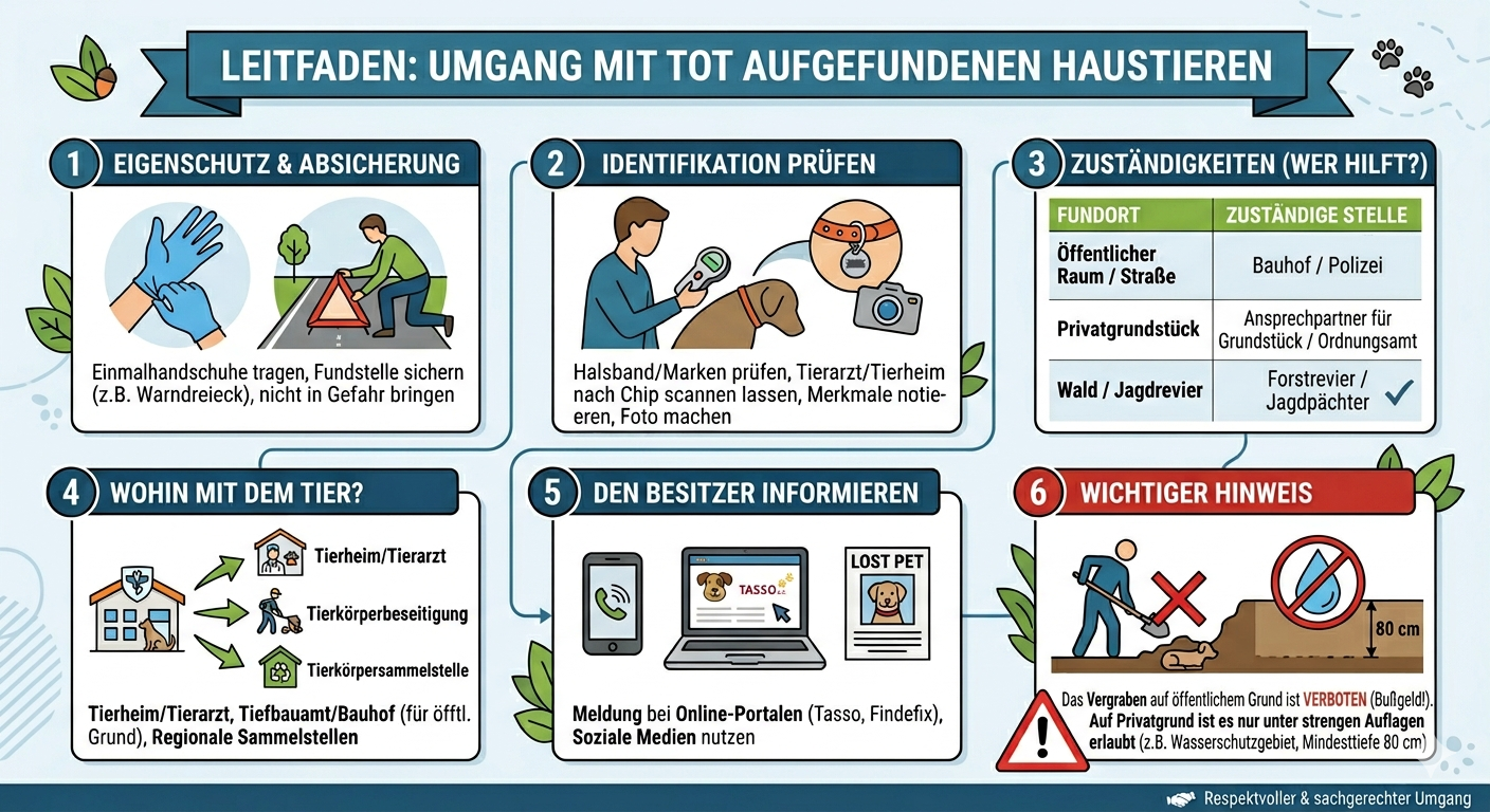 Viele Menschen sind unsicher, wie sie sich beim Fund eines toten Tieres verhalten sollen. Die folgenden Schritte helfen dabei, richtig zu handeln: