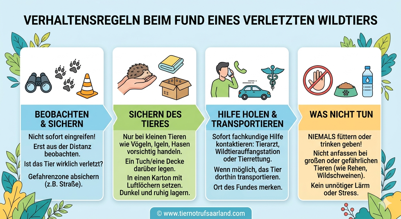 Nicht jedes Wildtier, das allein angetroffen wird, befindet sich in einer Notlage. Gerade bei Jungtieren ist Zurückhaltung gefragt, da viele Wildtiere zeitweise von ihren Eltern verlassen werden und trotzdem gut versorgt sind. Der Tiernotruf Saarland e.V. betont daher einen verantwortungsvollen Umgang mit Eingriffen in die Natur.