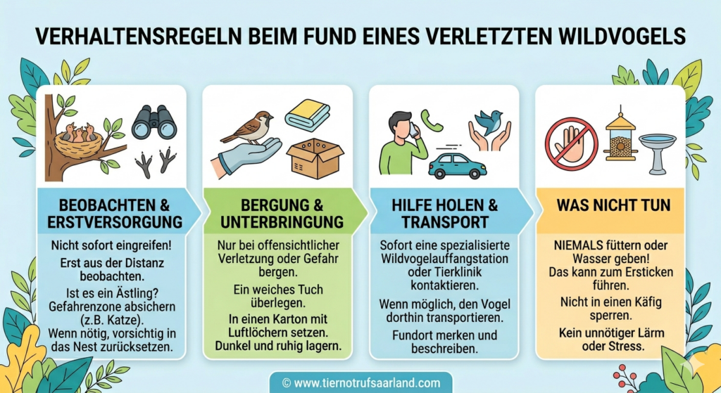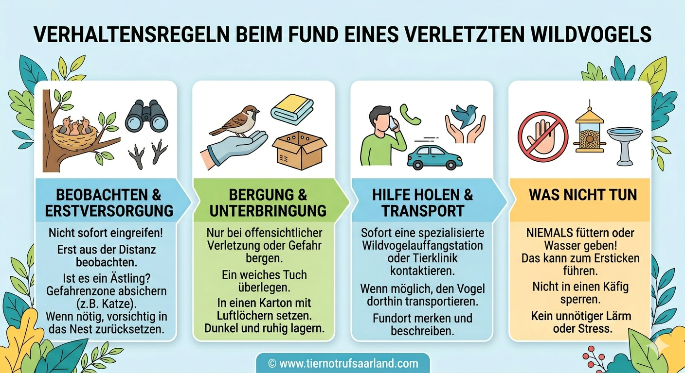 Wer einen verletzten oder flugunfähigen Vogel findet, sollte Handschuhe oder ein weiches Handtuch verwenden und den Vogel vorsichtig, aber sicher umfassen, wobei die Flügel am Körper fixiert und der Kopf freigelassen werden. Dann wird der Vogel in einen gut belüfteten Karton mit weichem Handtuch oder Küchenpapier gesetzt. Dabei gilt: Keine Futter- oder Wasserzufuhr anbieten – dies kann lebensgefährlich sein.